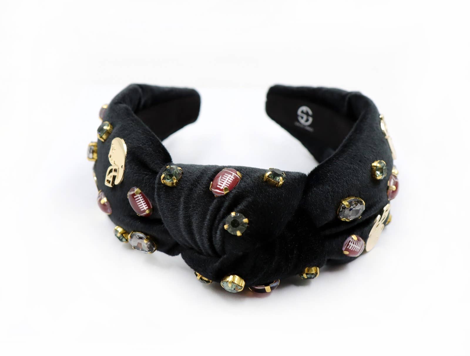 Top off your game day look with the Game Day Glam Beaded Headband – where sporty meets chic. Crafted from plush black velvet, this statement headband is adorned with gold-tone football helmets, mini football beads, and sparkling gemstones for the perfect mix of fierce and feminine. The padded design adds height and drama while staying comfortable enough for all-day wear, whether you’re in the stands, at a tailgate, or heading out after the game.