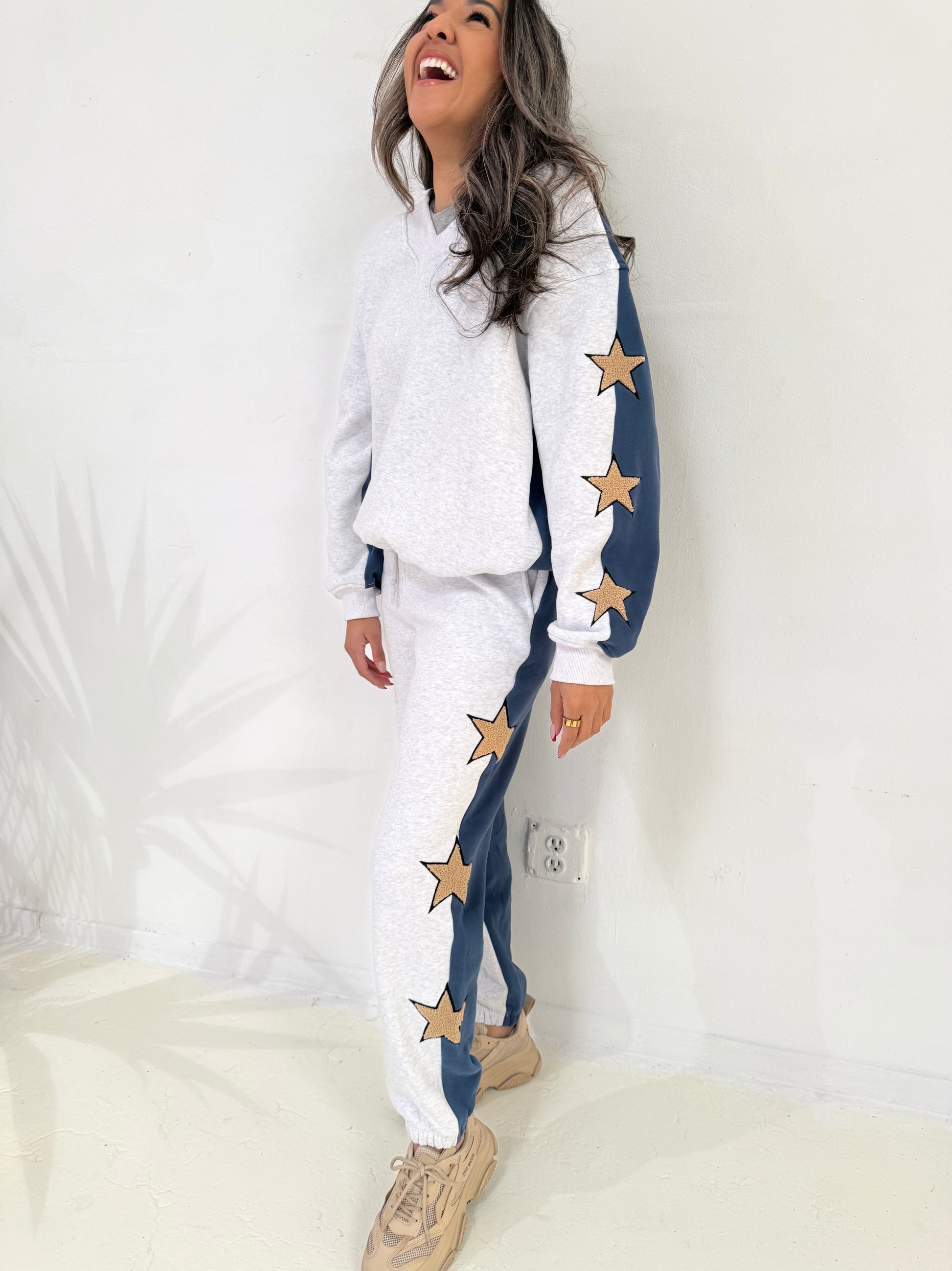 Elevate your casual style with these Color Block sweat set featuring eye-catching star details. Crafted from soft, breathable fabric, they offer maximum comfort while adding a playful, modern touch to your wardrobe. Perfect for lounging or running errands, these sweatpants combine functionality with a fun, bold design.