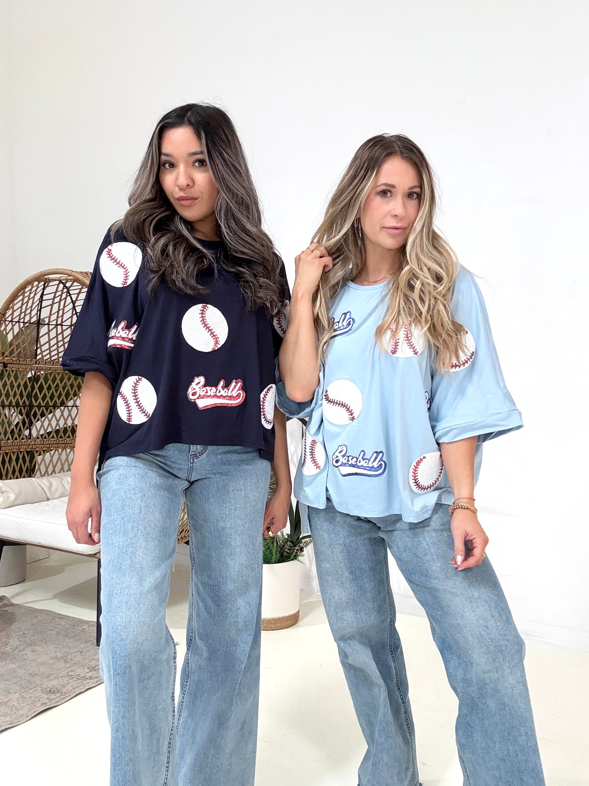 Can't hit on me! Our Hey Batter Batter Tee is a boxy baseball tee with sequin baseball balls and 'baseball' all over.