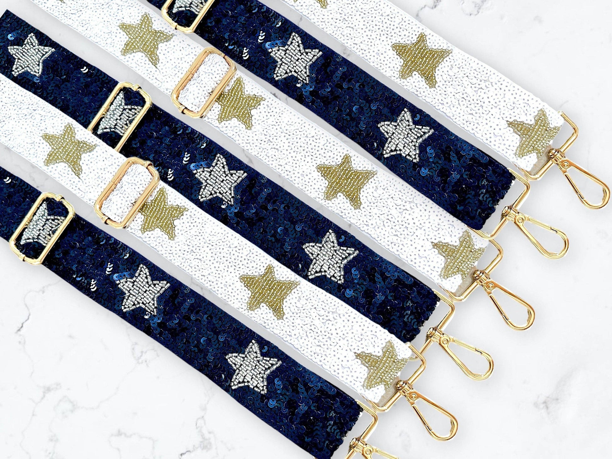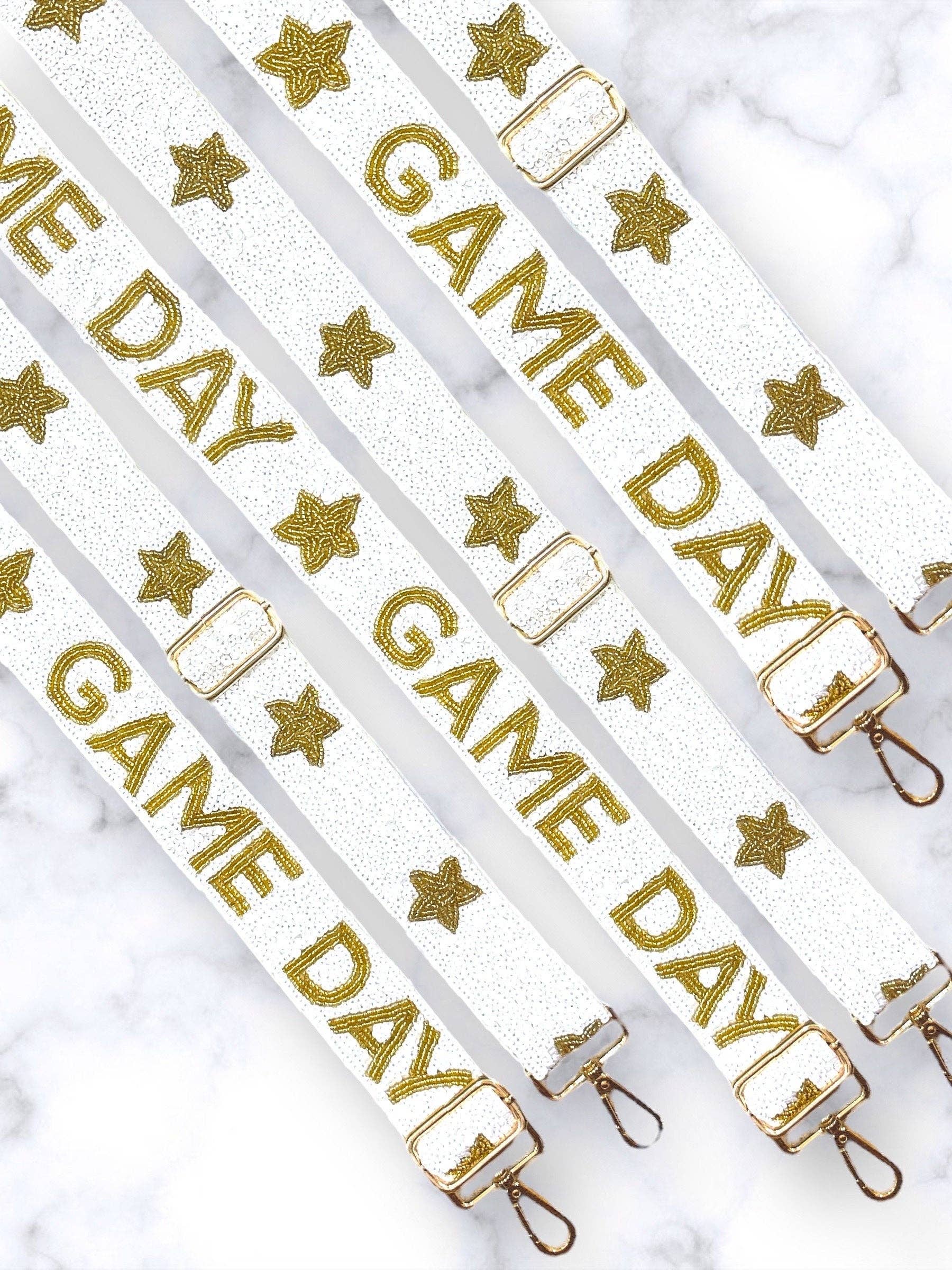 Elevate your game day style with this dazzling white and gold beaded bag strap! This handmade accessory is the perfect way to add a touch of glamour to your clear stadium bag. The intricate beadwork features a stunning combination of white and gold beads, creating a look that's both chic and sporty. The adjustable strap ensures a comfortable fit for all, while the sturdy gold hardware adds a touch of luxury. Whether you're cheering on your favorite team or attending a concert, this beaded bag strap is sure to turn heads.
