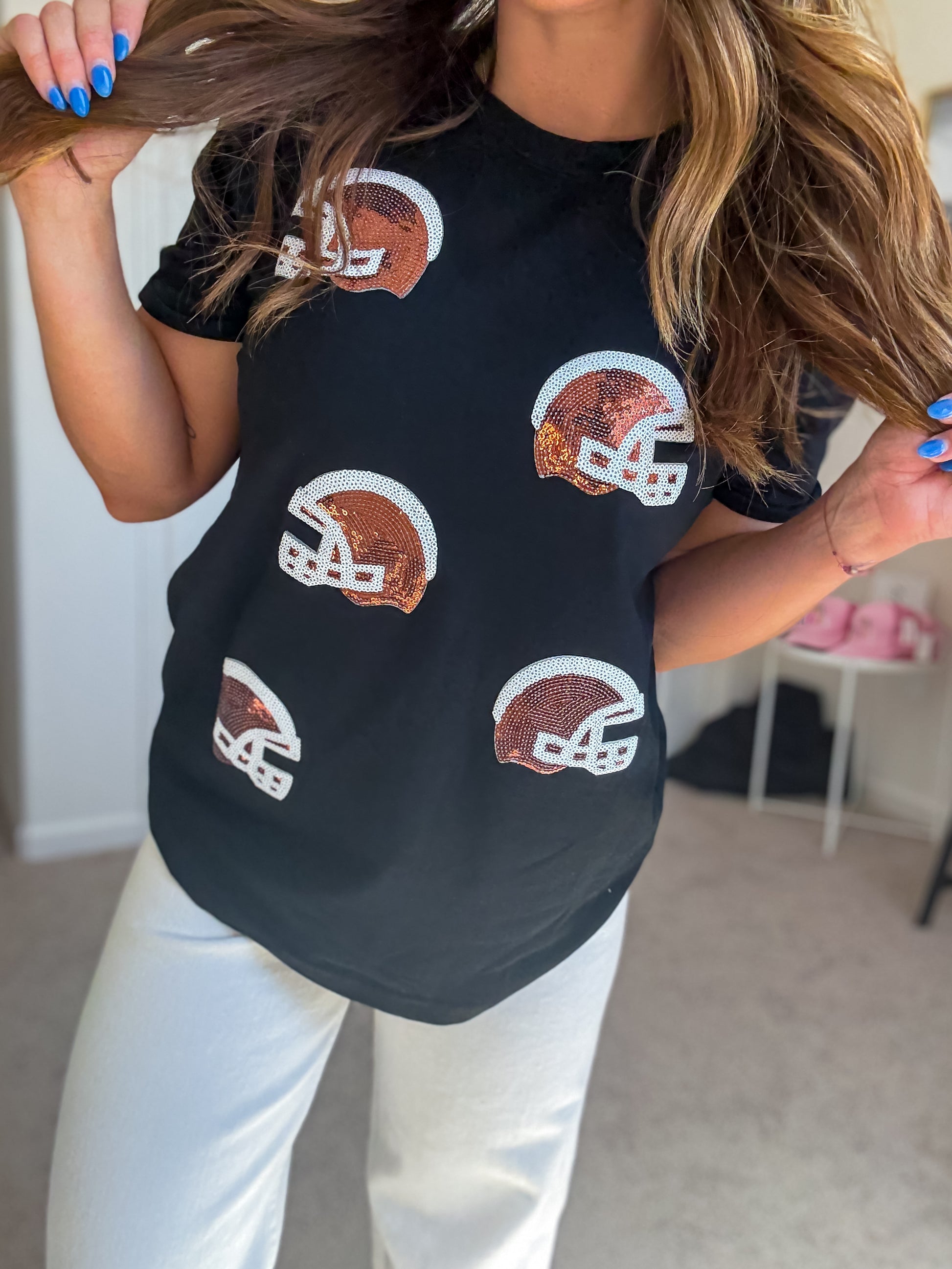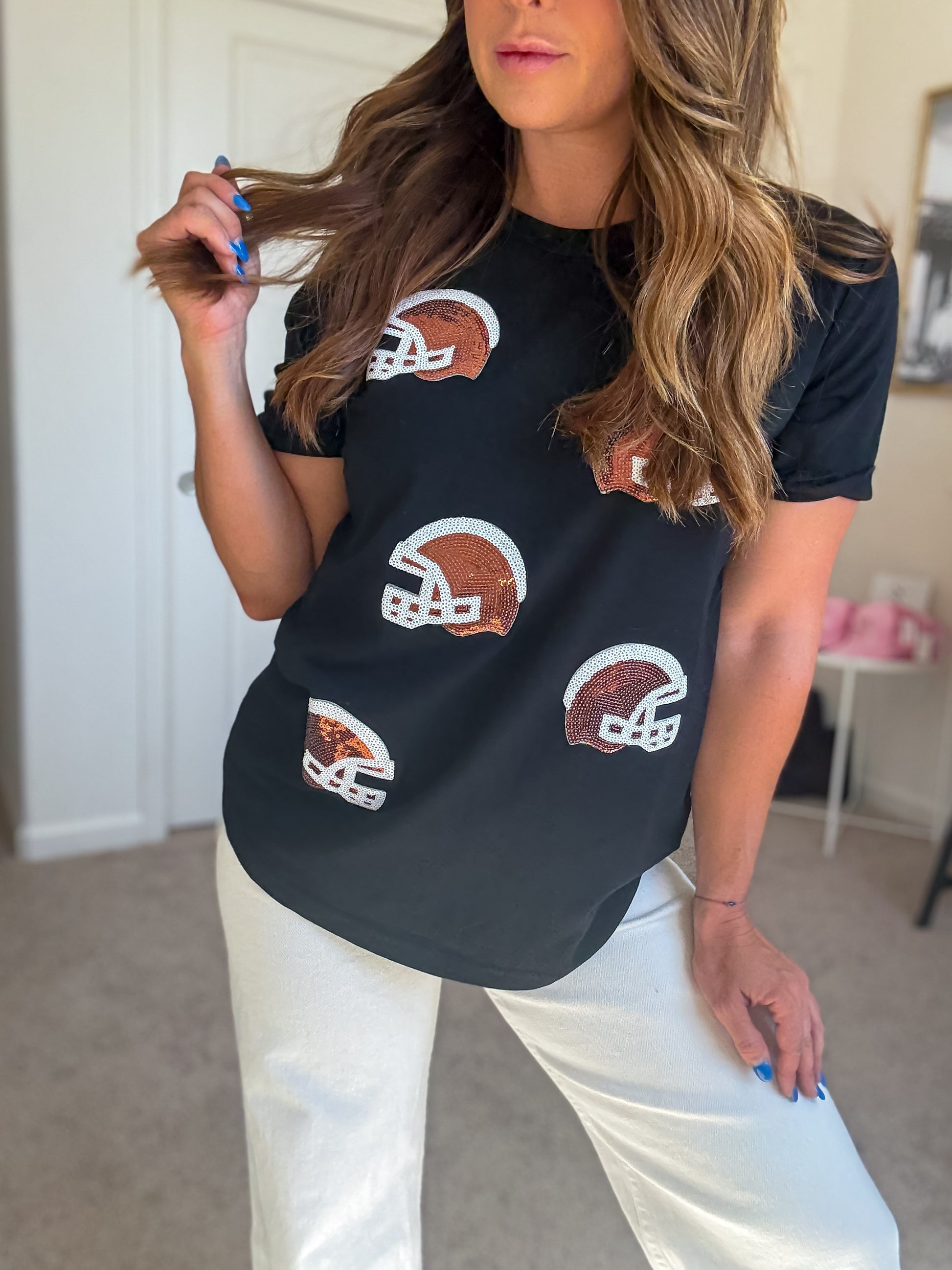 Shine bright on the sidelines with our Sequin Football Helmet Game Day Tee. This black short-sleeve top is covered in shimmering sequin football helmets, bringing the perfect blend of sporty spirit and glam. Made from a soft, comfortable fabric with a relaxed fit, it’s ideal for pairing with jeans, skirts, or shorts for a standout game day look. Whether you’re tailgating, cheering from the stands, or hosting at home, this tee scores major style points.